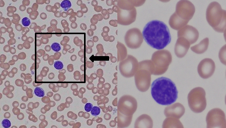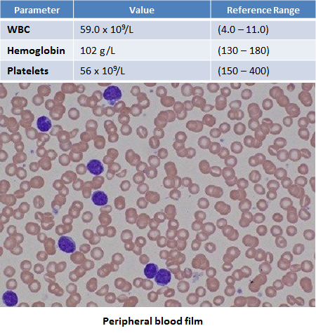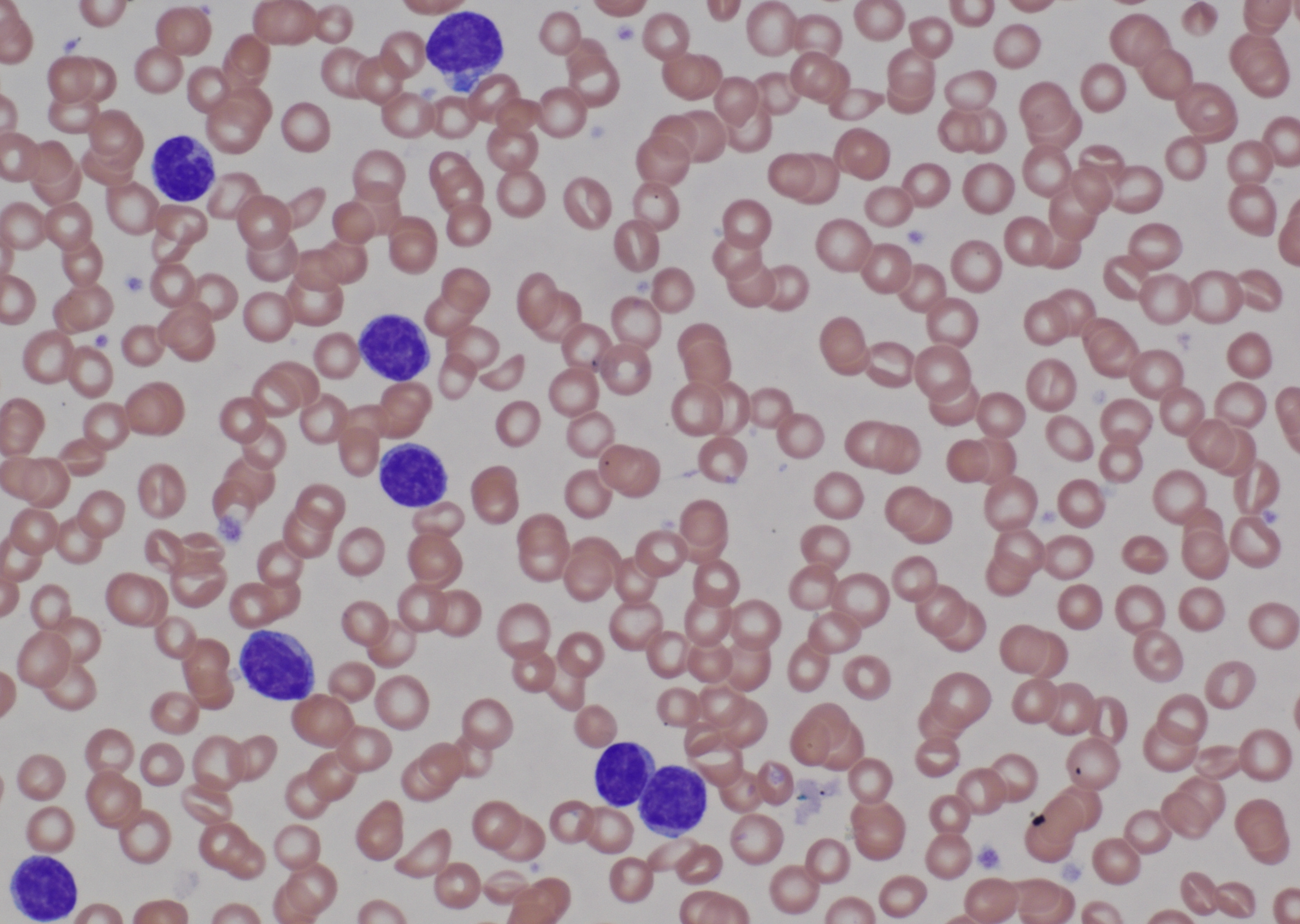 An 80 year old male with a history of weight loss, fatigue and lymphadenopathy presents to hospital. A CBC was ordered. Due to the elevated WBC count and low platelets for a first time patient, flags were triggered on the hematology analyzer indicating a manual peripheral blood film review.